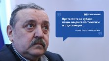 „Когато водим нормален и спокоен разговор, вероятността да се заразим с коронавирус е много малка, защото безсимптомният човек, както и човекът с много леки симптоми, отделят малко количество въздух. Когато разговорът е спокоен, рискът е минимален или просто го няма. Опасно е обаче, когато дори на открито някой заразен вика, говори високо, много емоционален е или пее. Тогава, даже при лека инфекция, но наличие на вируса в неговите горни отдели на дихателната система, той може да зарази. Затова викането, събирането на хора, протестите, например, са много хубаво нещо, но да минават малко по-цивилизовано - по-тихичко и с дистанция.” Думи на директора на Центъра за заразни и паразитни болести проф. Тодор Кантарджиев.