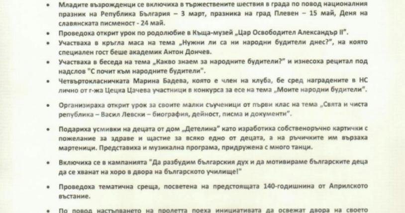 Той припомни, че клубът е сред първите у нас и е основан в началото на учебната 2014 / 2015 г., когато броят на клубовете в страната е едва 33. За учебната 2015 / 2016 г. клубовете „Млади възрожденци” са около 200 в цялата страна.