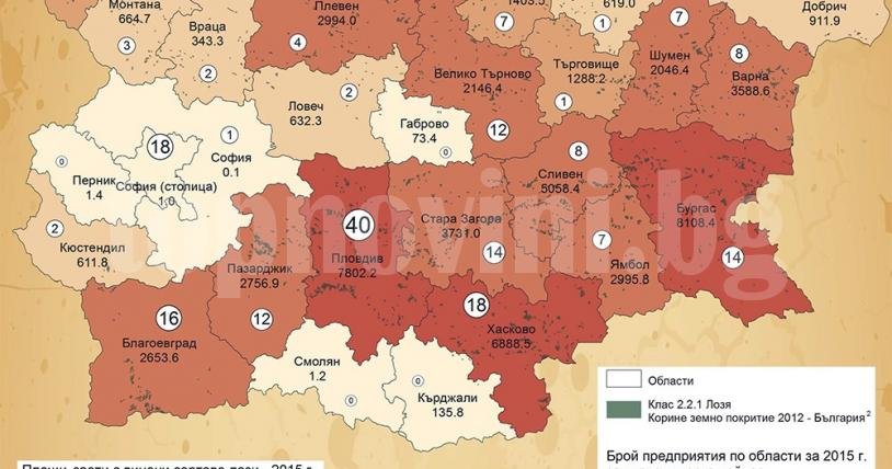На първо място в класацията с най-много предприятия за производство на вино е Пловдивска област с 40 винарни. Второто място с по 18 предприятия, заемат София-столица и област Хасково, а трети е Благоевградска област – с 16 предприятия.