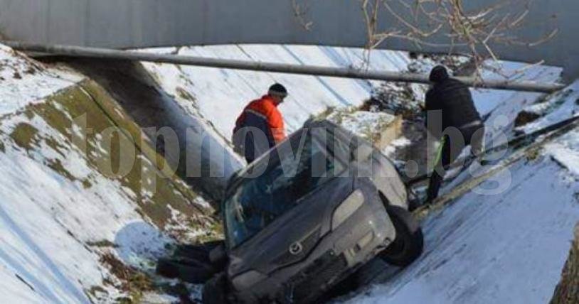 Заради поледицата лекият автомобил тръгнал надолу, водачът му не успял да спре и той паднал в коритото на реката.