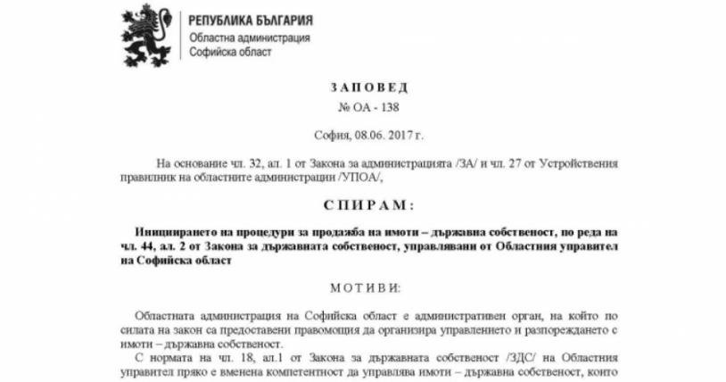 Областният управител на София област Илиан Тодоров е издал заповед, с която забранява продажбата на държавна собственост. За това той се похвали пред Нова телевизия. Заповедта ми ще е валидна докато следващият областен я отмени, заяви представителят на Атака. "Спира се продажбата на държавни имоти в Софийска област. Съжалявам, че Атака нямаше възможност да направи нещата преди 10 години. Ако това беше станало, нямаше да има разграбена държава. Аз съм първият от 28-те областни управители, който забранява продажбата на държавни имоти", сигурен е Тодоров.