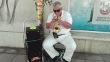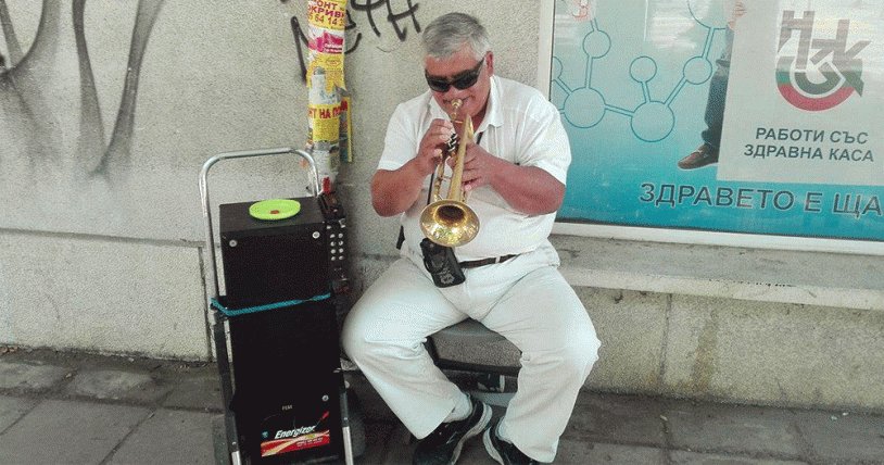 Още от сутринта на днешния Видовден уличен музикант предизвикваше усмивките на случайните минувачи около бившия хотел „Плиска“ в столицата. Звуците от нежния му тромпет допълваха аромата на нацъфтелите липи.