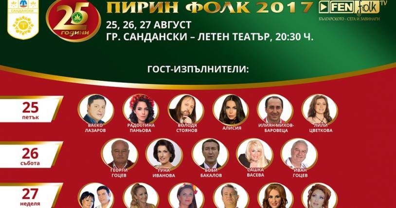 По повод юбилейното 25-то издание на престижния фестивал за авторска македонска песен и изпълнителско изкуство „Пирин Фолк“ на сцената в Летния театър в гр. Сандански ще прозвучат 25 емблематични песни от историята на форума. Всички те са били отличени с награди или са останали в сърцата на ценителите на македонската песен и се слушат и до днес.