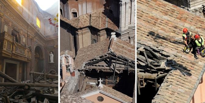 Инцидентът е станал вчера следобед, докато църквата "S. Giuseppe dei Falegnami" е била затворена. На мястото са повикани пожарникари, които за всеки случай са използвали и кучета, които да търсят евентуално затрупани под руините.