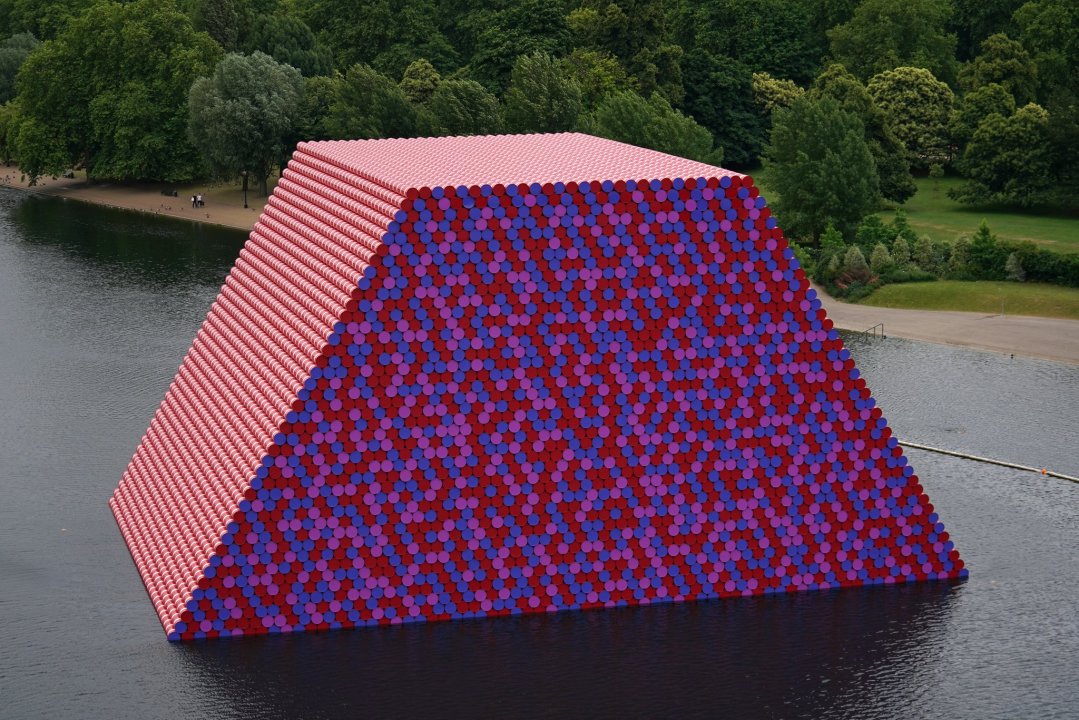 Става дума за загадъчната пирамида Мастаба, "изградена" с помощта на 7506 варела насред езерото Серпентината в лондонския Хайд Парк.