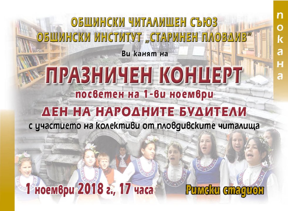 На 1 ноември 2018г. Общинският читалищен съюз – Пловдив организира празничен концерт в чест на общобългарския празник - Ден на народните будители на Римския стадион, с начален час - 17 часа.