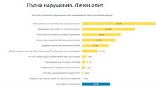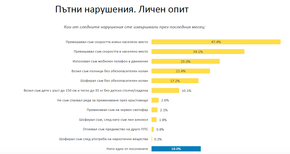 Друг въпрос от анкетата е свързан с нарушенията, които шофьорите си признават, че извършват на пътя. Едва 18% от всички анкетирани посочват, че през последния месец не са извършвали нито едно нарушение. Превишаването на скоростта, ползването на телефон в движение и незакопчаването на предпазен колан са най-често признаваните „прегрешения“ от водачите. След употреба на алкохол, зад волана сядат хора до 25 години, от София и с малък стаж. Близо половината от нарушителите никога не са били санкционирани от Пътна полиция.