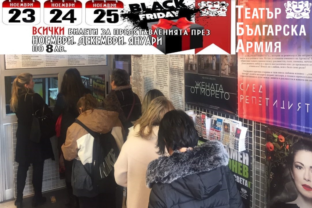 Театър "Българска армия" обяви Черен петък в продължение на три дни за билетите от собствените си продукции. На 23, 24 и 25 всички билети ще бъдат по 8 лева. В разпродажбата са включени билети за постановки през ноември, декември и януари.