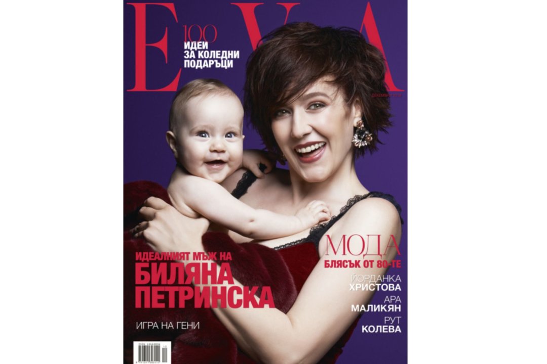 Биляна Петринска позира със сина си Адриан за декемврийската корица на списание EVA. Момченцето се роди на 9 юни, а нежната емблема на българския театър побърза да обяви появата му във Фейсбук с прочувствено послания.