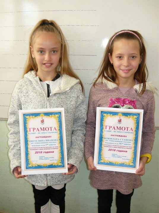 Рисунките на две третокласнички от СУ „Иван Момчилов“ в Елена ще участват в Националния конкурс „Полицаят е мой приятел и учител“. Творбите на момичетата от класа на Йорданка Грънчарова са отличени на областния конкурс на същата тема. Рисунката на Цветелина Янакиева е класирана на първо място, а на Божидара Пламенова е трета.