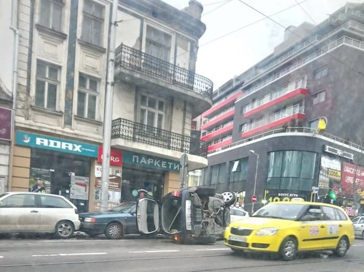 При катастрофата колата е ударила няколко паркирани автомобила. За щастие няма пострадали пешеходци. Шофьорът на преобърнатия автомобил е откаран в болница.