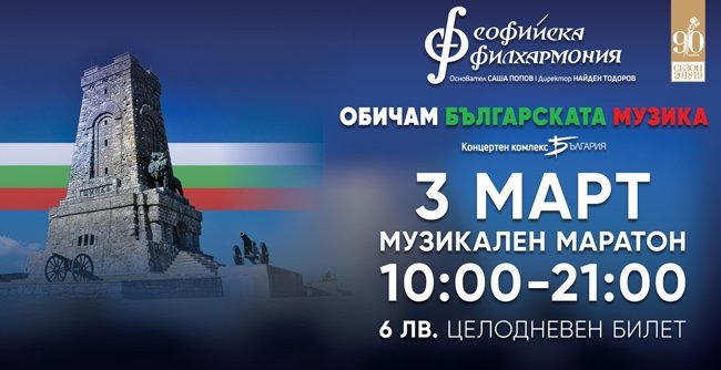 За поредна година Софийската филхармония и зала "България" отварят сърца и врати за българската музика. И тази година на 3 март Концертен комплекс България става домакин на музикалния маратон под надслов "Обичам Българската музика". Близо 400 изпълнители ще представят шедьоври на родното музикално изкуство в камерната и голямата зали "България". Сред изпълнителите са камерните формации "Филхармоника", "Бела Воче", хор "Нуша", хор "Гусла", групата за автентичен фолклор "Бистришките баби и внучки", Биг бендът на БНР, формации от НМУ "Любомир Пипков" - София, НМА "Проф. Панчо Владигеров" - София, хор "Нуша", хор "Ваня Монева", Националният филхармоничен хор, детският филхармоничен хор, оркестърът на Софийската филхармония.