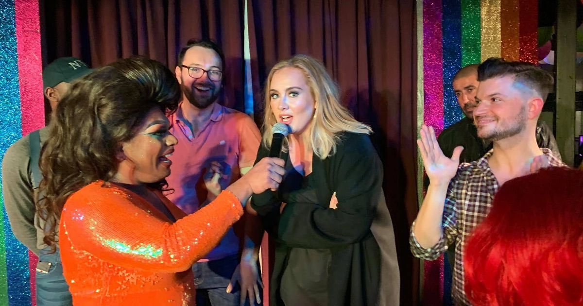 ADELE WITH A FAN AT PIECES BAR ( GAYBAR ) LAST NIGHT. SHE LOOKS SO GOOD!! #adele #adeleadkins pic.twitter.com/QHN8uxkTwa