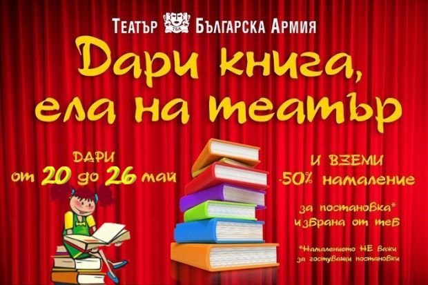 И тази година Театър “Българска армия” ще приема книги както за деца, така и за възрастни, а срещу всяка дарена книга, „дарителите” ще получават талон за 50% отстъпка от цената на 1 билет, за постановка по избор през май, или юни. Препоръчително е изданията да бъдат нови или такива, които са по-стари, но в запазено състояние. Кампанията продължава до 26 май.