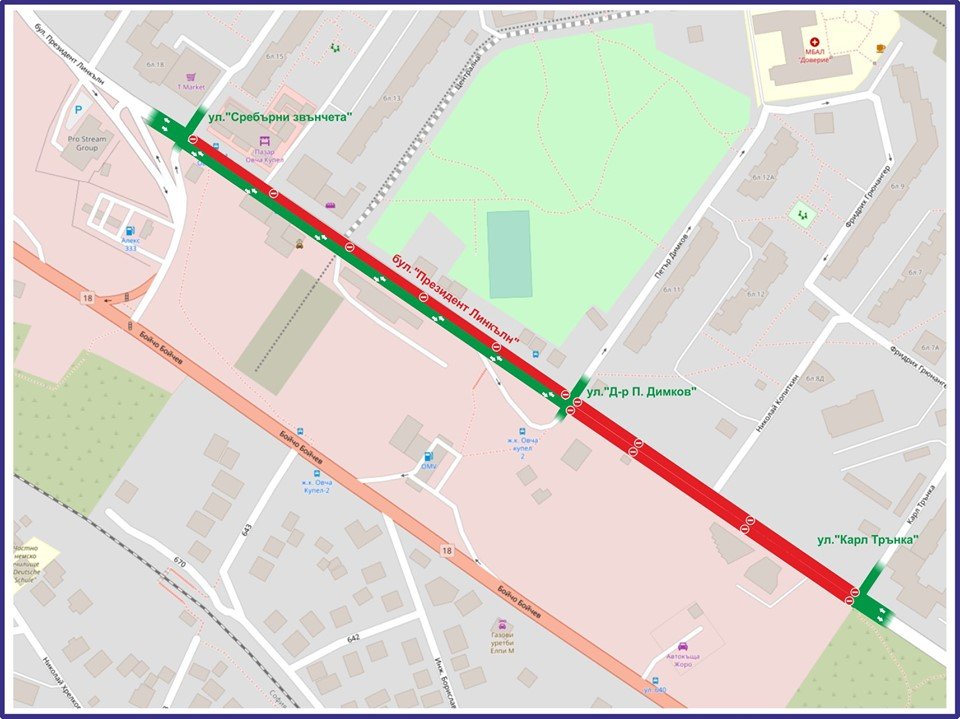 От днес до 28 юни се затваря за ремонт участъка от бул."Президент Линкълн" от ул."Карел Трънка" до ул. "Д-р П. Димков". Движението от булеварда между ул."Д-р П. Димков" и ул."Сребърни звънчета"ще се извършва двупосочно по едното пътно платно.