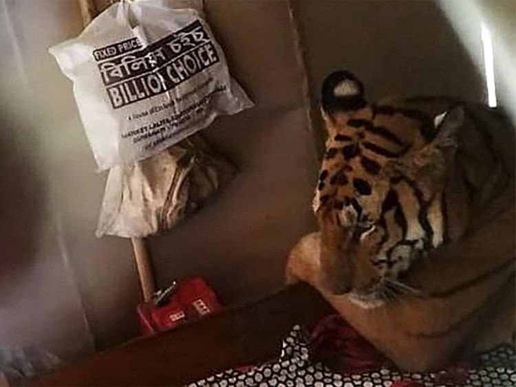 Длъжностни лица от група за опазване на дивата природа пристигнаха в къщата и насочиха тигрицата обратно към дома ѝ – джунглата.