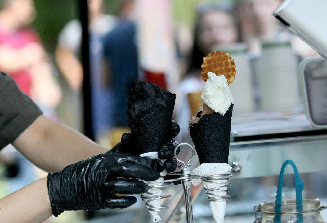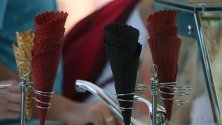 „Машината която използваме прилича на гофретник, но е плоска. Цветът на фунийките е от активен въглен като предлагаме и черен сладолед от черен сусам. Заради сметаната той става малко по-светъл и затова добавяме и активен въглен, и така той става напълно черен“, споделя рецептата Ели Спасова и добавя, че червената фунийка става с помощта на червено цвекло на прах.