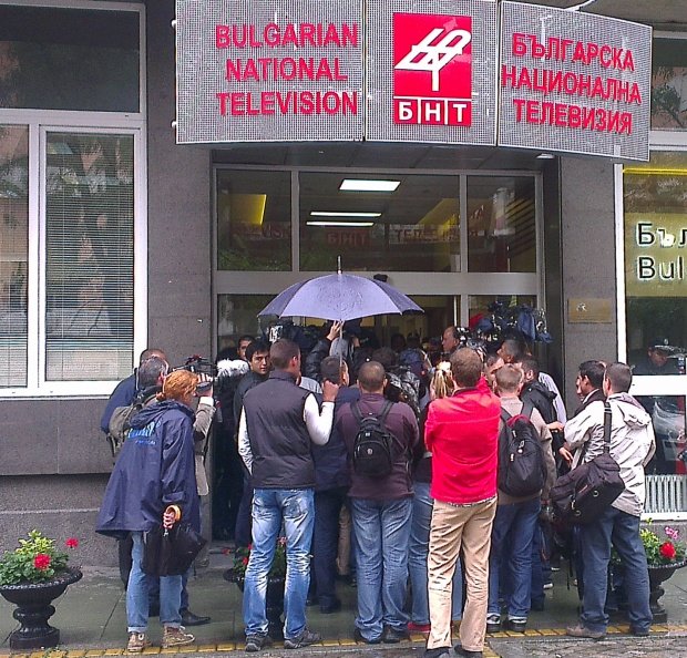 Лидерът на партия "Атака" Волен Сидеров и кандидат за кмет на София изпълни обещанието си и поведе протест пред сградата на БНТ. Множеството, спечелено чрез този прийом, скандираше "Оставка!".