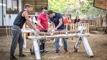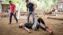 С режисьора премериха сили в играта „Събаряне на трупи“, която включваше екстремна комбинация от разплитане на въже, сеч с брадва и обстрел по двуметрови талпи с въртяща се пясъчна торба.