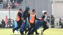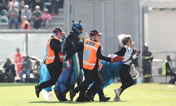 Парашутистът беше бързо „изваден“ от терена след намесата на охраната на стадиона.