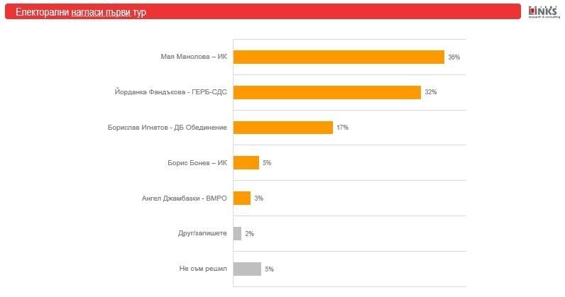 На първи тур Мая Манолова събира 36%, Йорданка Фандъкова - 32%, а Борислав Игнатов - 17%, сочи най-новото представително проучване на "Маркет Линкс", проведено по поръчка на OFFNews в периода 15-20 октомври.