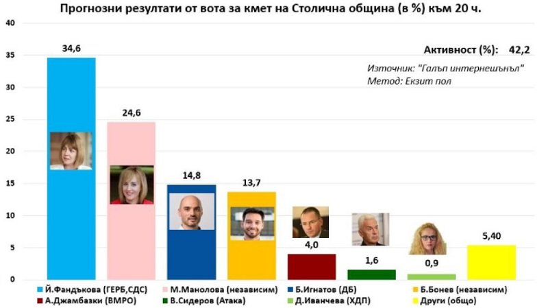 се очаква балотаж. Там Огнян Ценков от ГЕРБ получава 33,2%, Цветан Ценков – кандидат на СДС – 29%, а Любомир Георгиев – кандидат на БСП – 20,1%, заяви Юлияна Гальова от „Галъп интернешънъл“.