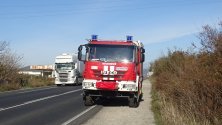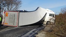 Товарният автомобил е превозвал гранули в чували. От удара в табелата се пробива резервоарът на автомобила, има разлив на гориво, пожарна изчаква количеството да изтече, за да го обработи.