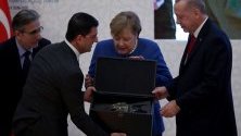 Президентът на Турция Реджеп Тайип Ердоган подари на германския канцлер Ангела Меркел инкрустирано огледало и шлем, предаде БТА. Подаръците символизират сила, разкош и богатство.