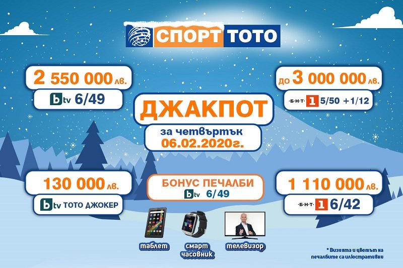 Над 2,5 милиона лева e натрупаният джакпот в играта „ТОТО 2 – 6 от 49“ за този четвъртък. Те ви дават шанс да продължите напред и да стигнете, докъдето ви отведат мечтите. Докато чакате тиража на 20.02.2020 г., не пропускайте предстоящите 4, защото в игрите на тотото вече са се натрупали апетитни суми, които ви дават шанс да се превърнете в 3-ия за годината тото милионер. Повече от 1,1 милиона лева ви очакват в играта „ТОТО 2 – 6 от 42“. „Тото Джокер“ също носи невероятна печалба, защото крие 130 хиляди лева джакпот. В 11-и тираж на Български спортен тотализатор са заложени и до 3 млн. лв. в играта „ТОТО 2 - Зодиак“. Проверете прогнозите на астролозите и нумеролозите. Месец февруари може да се окаже късметлийски за вас.