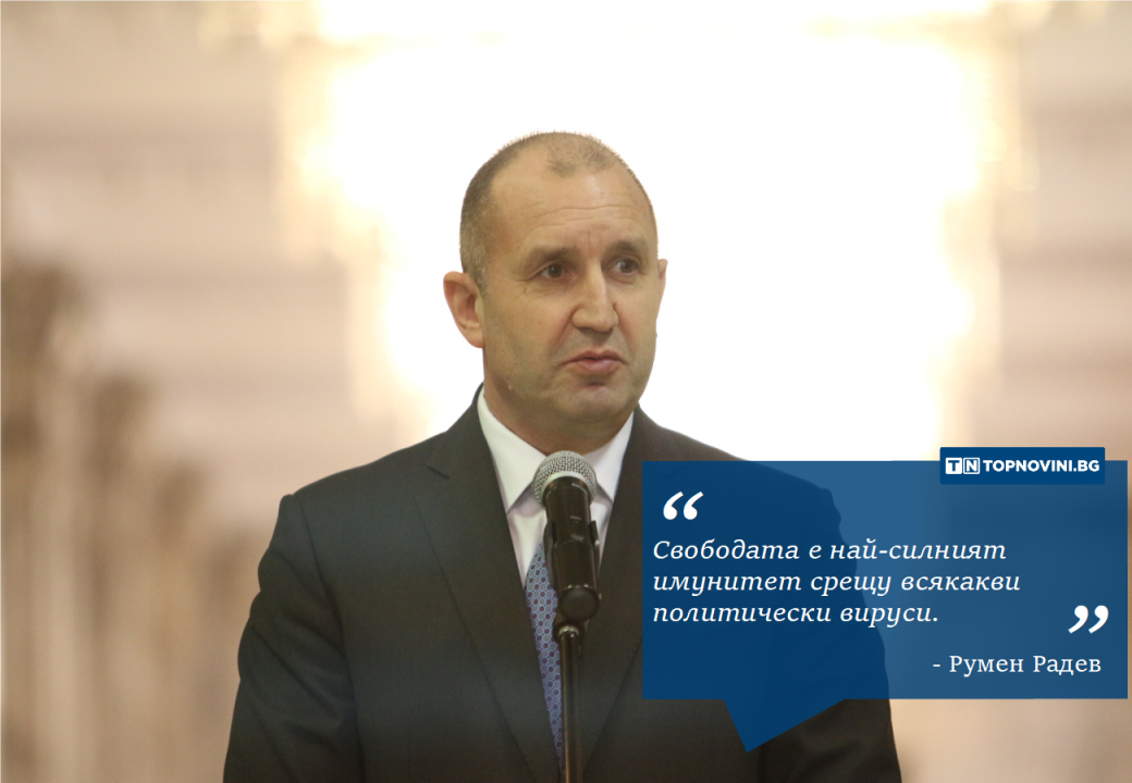 „Свободата е най-силният имунитет срещу всякакви политически вируси". Това заяви президентът Румен Радев в словото си по време на тържествената заря-проверка  в столицата по случай отбелязването на 142 години от Освобождението на България. По-рано на връх Шипка държавният глава също говори за "вируса" и определи отмяната на честванията на върха като манипулации: "Каква ли щеше да бъде съдбата на България днес, ако онези велики българи се бяха поддали на "вируса" на манипулацията, на "вируса" на страха, на "вируса" на примирението, на "вируса" на слабоволието? Но те устояха и не се поддадоха, както всички вас, за които дългът към паметта е свят и неотменим".