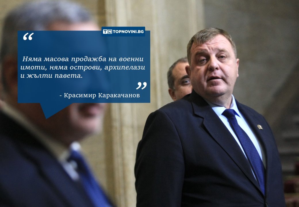 Споменавате острови, полуострови, архипелази, централни апетитни имоти – може би Чукотка... За тези три години, откакто съм министър, са продадени 16 имота“. Това каза министър Красимир Каракачанов в отговор на обвиненията за злоупотреби с военни имоти.Той посочи, че по негово време са продавани най-малко имоти и обвинението на „Атака“ е лъжа.