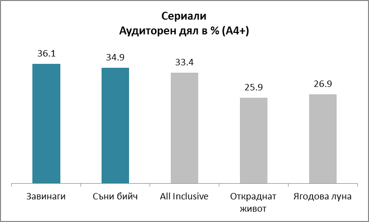 „Съни бийч“ най-предпочитаното заглавие сред българските сериали за миналия месец, като двата му епизода, излъчени през февруари, привлякоха почти 1 милион зрители средно и близо 35% от аудиторията в два поредни петъка. Най-гледаният сериал за месеца беше турската сага по bTV - „Завинаги“.