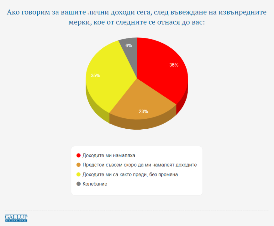 Обезпокояващи обаче са числата, описващи икономическото състояние и тревоги на населението: повече от 1/3 декларират, че след въвеждането на извънредно положение доходите им са намалели. Други близо 1/4 живеят с чувството, че съвсем скоро предстои доходите им да намалеят.