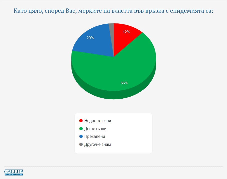 Две трети от българите смятат, че мерките, които властта взема, са достатъчни. Това показва вторият експресен сондаж по отношение на коронавируса и действията на правителството, проведен от социологическа агенция "Галъп интернешънъл". Леко нараства спрямо предходната седмица делът на тези, които смятат мерките за прекалени (сега са 20%) и слабо намалява делът на считащите, че мерките са недостатъчни (12%). Самите мерки са „неприятни, но поносими“ за 82% от българските граждани. Други 15% отговарят, че те са „вече непоносими“.