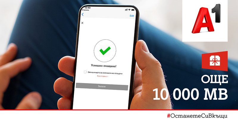 А1 обяви нова инициатива за еднократен бонус от 10 000 МВ мобилен интернет на максимална скорост, само седмица след като подари по 10 000 МВ интернет през Моят А1 на всички свои частни клиенти на мобилна услуга в първите дни от извънредното положение в страната.