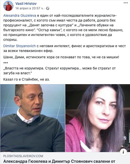 Така водещата на “Култура.бг” Александра Гюзелева-Шани се свързва с екипа на “Площад Славейков”, за да алармира, че тя й колегата й Димитър Стоянович са отстранени от културния блок. Сайтът веднага подхваща новината, без да провери фактите. А те гласят, че и Шани, и Стоянович продължават да са в трудово-правни отношения с телевизията-майка.