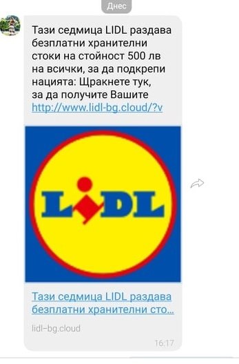Фалшива обява от името на Лидл се разпространява в интернет. Възможно e да получите манипулативната информация на лично съобщение по Viber. В него се твърди, че тази седмица Лидл раздава безплатни хранителни стоки на стойност 500 лева в подкрепа на нацията.