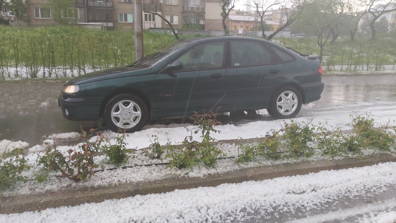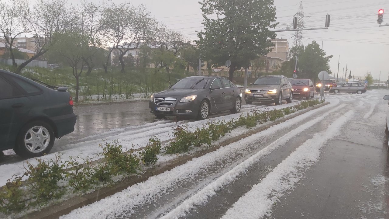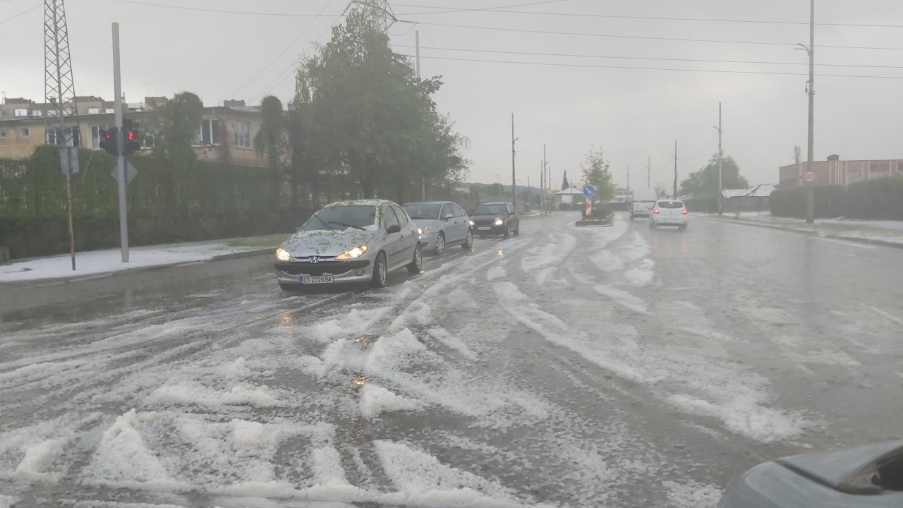 Проливен дъж с градушка се изсипаха над Казанлък. Бурята продължи повече от час, а ледените топчета бяха с големината на грахово зърно.