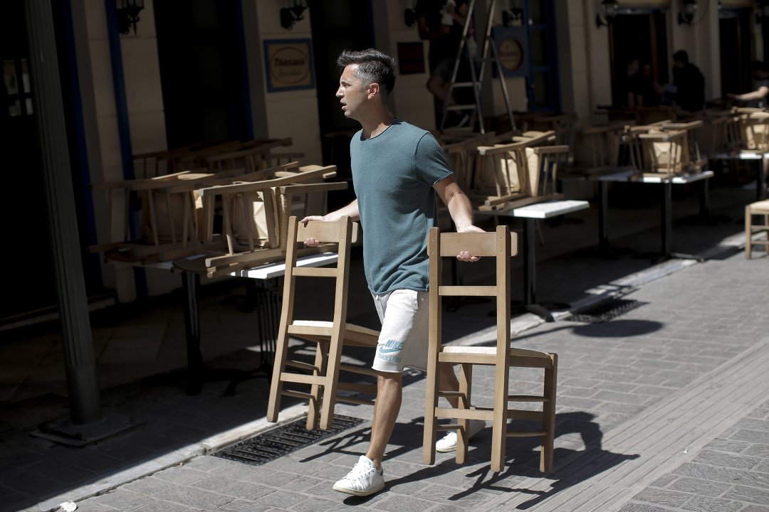 Под строг контрол на здравните служби масите в заведенията са поставени на необходимото разстояние за стриктно спазване на социална дистанция. Обслужването на клиенти е само на външни маси. Сервитьорите са с предпазни маски и ръкавици. Работодателите, които запазят работните места, ще получат данъчни облекчения, заяви министърът на развитието Георгиадис.