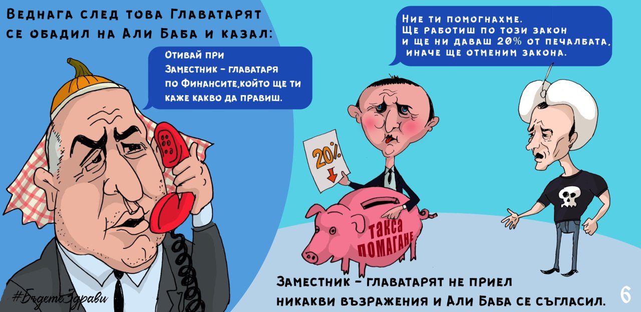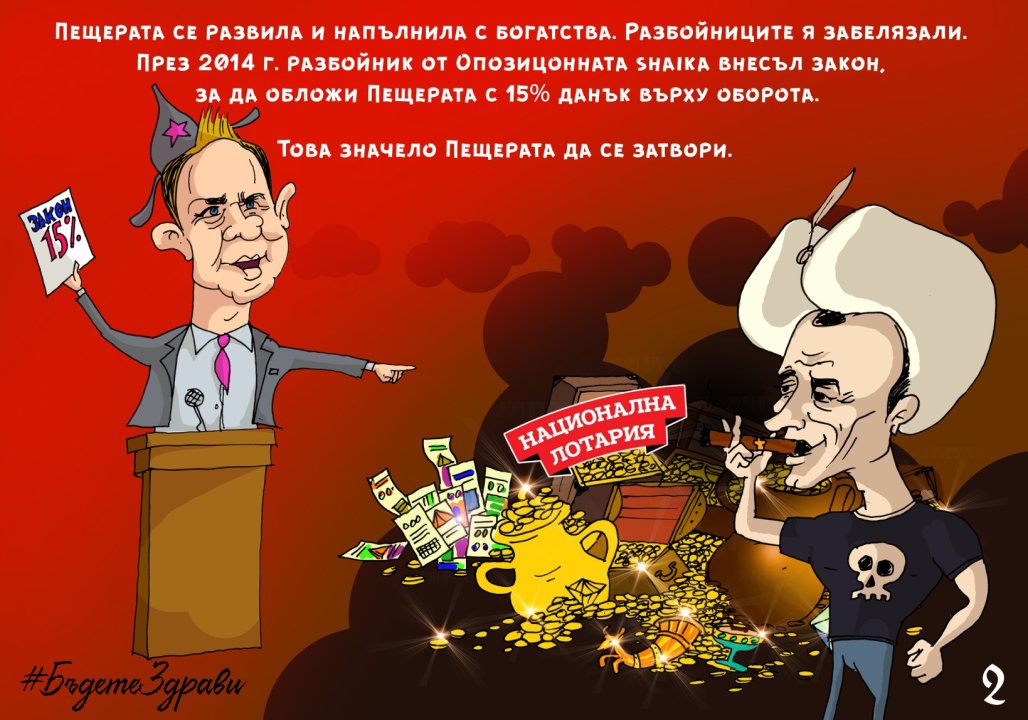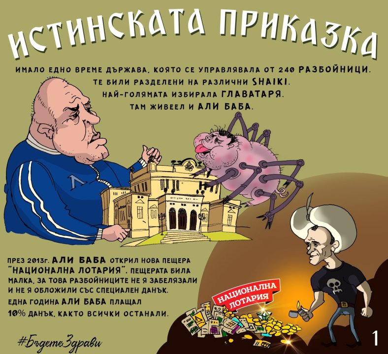 Под формата на комикс, качен в профила му в социалната мрежа Facebook, Васил Божков разказва история, според която Законът за хазарта е бил променен в полза на "Национална лотария", но срещу ангажимент той да се "отчита" обратно.