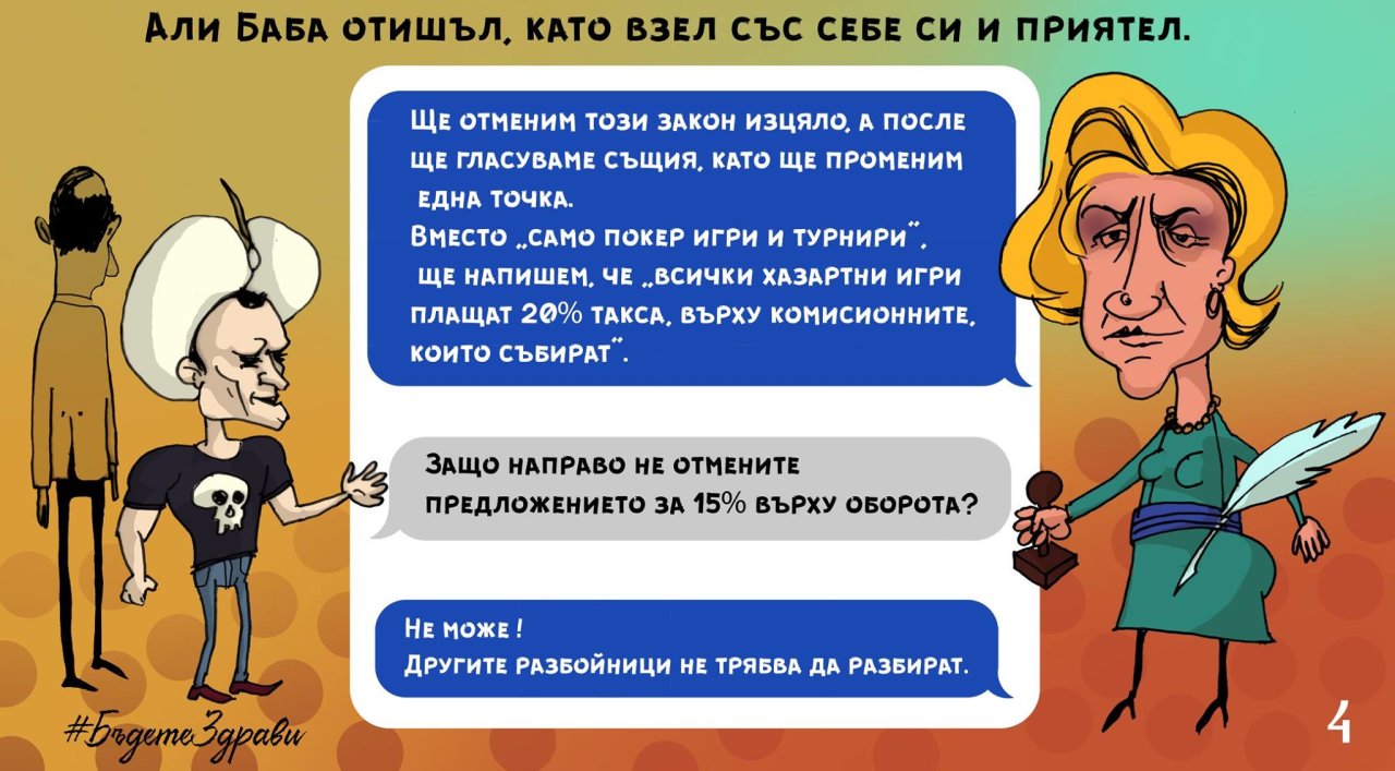 - „Ще отменим този закон изцяло, а после ще гласуваме същия, като ще променим само една точка. Вместо „само покер игри и турнири“, ще напишем, че „всички хазартни игри плащат 20% такса, върху комисионните, които събират“.