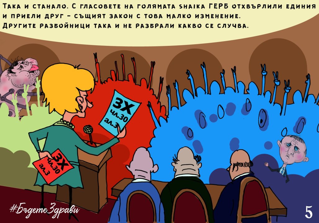 Така и станало. С гласовете на голямата shaika ГЕРБ отхвърлили единия и приели друг - същият закон с това малко изменение. Другите разбойници така и не разбрали какво се случва.