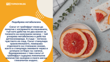 Плодовете са сред предпочитаните и най-често препоръчвани хранителни продукти при всякакви ситуации - от диетите до засилването на имунитета. Един от най-предпочитаните плодове е грейпфрутът. Само няколко минути са нужни на ден, за да приготвим пресен сок от плода, който носи много ползи за здравето.