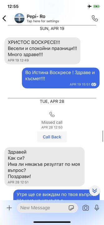 На 28 април т.г. в 15.04 ч. „Pepi- Ro“ отправя до П.Б. следното запитване: „Има ли някакъв резултат по моя въпрос?“. В 16.34 ч. е регистриран разговор между П.Б. и „Prezident-Pl. Uzunov“, след което в 16.36 ч. П.Б. изпраща на „Pepi- Ro“ съобщение със следното съдържание: „Утре ще се виждам по твоя въпрос! Ще има, но няма да е светкавично!“.