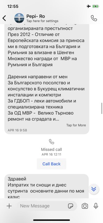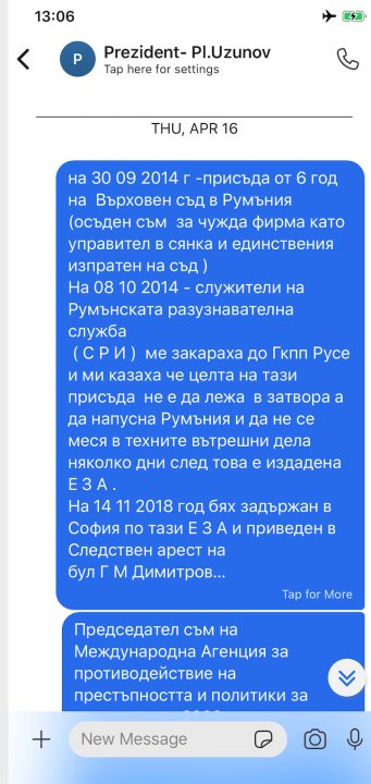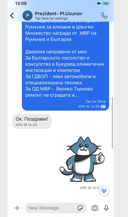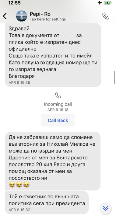 На 16 април т.г. „Pepi- Ro“ изпраща на П.Б. информация, отнасяща се до неговото пребиваване и осъждане в Румъния, вкл. направени от него дарения. Няколко часа по-късно П.Б. препраща съобщенията на „Prezident-Pl. Uzunov“, който от своя страна отговаря следното: „Ок. Поздрави!“