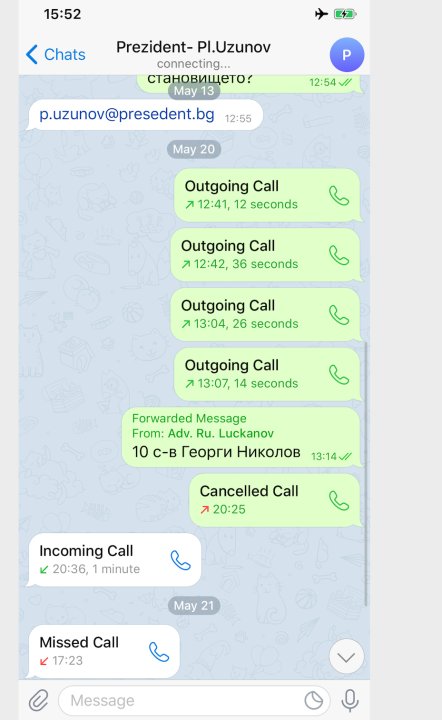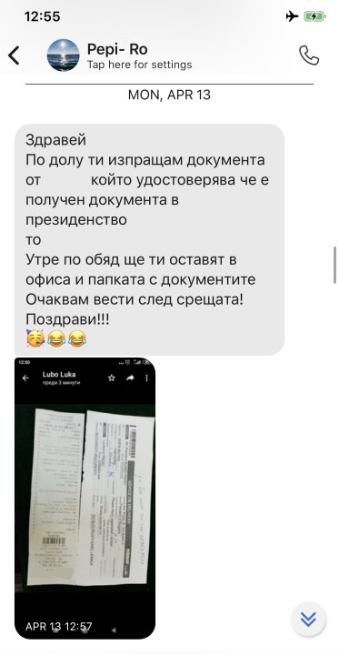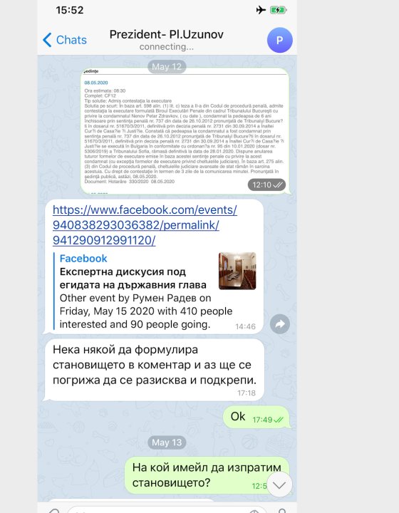 На 12 май 2020 г. в 12.10 ч. П.Б. препраща снимката на „Prezident-Pl. Uzunov“. В 12.13 ч. П.Б. пише на „Pepi- Ro” съобщение със следното съдържание: „Трябва официално извлечение от румънския съд и превода му на български!“