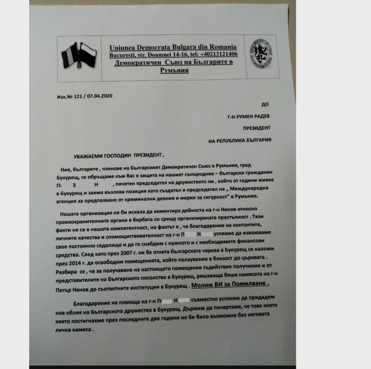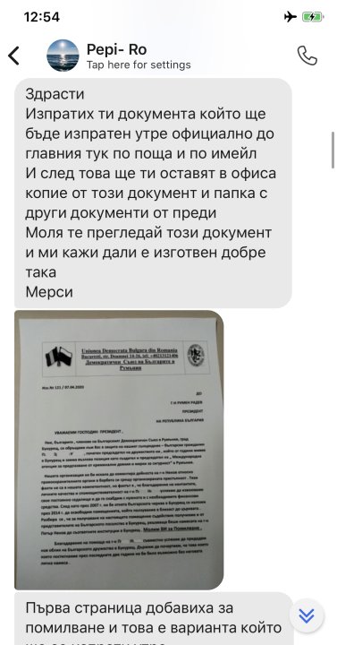 На 07 април т.г. „Pepi- Ro“ изпраща на П.Б. снимка на писмо, адресирано до президент на Република България от Демократичен съюз на българите в Румъния, в което се иска помилване на българския гражданин П.З.Н.