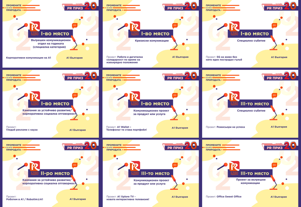 Кампаниите, с които А1 спечели първи места, са в едни от най-оспорваните категории. „Работа и дигитална солидарност в извънредно положение“ беше победител в категория „Кризисни комуникации“. Проектът беше отличен заради цялостната стратегия и реализация на комуникациите със служителите, клиентите и обществеността през март 2020 година. В една от най-конкурентните категории в конкурса - „Специално събитие“, А1 спечели с проекта „5G без нито един пострадал гълъб“ – за представянето на възможностите на петото поколение мобилни мрежи по време на финалите на A1 Gaming League и фестивала Aniventure Comic Con.