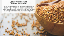Учени разкриха пред света кои хранителни вещества снабдяват нашето тяло с добилия наскоро популярност „протеин на дълголетието”. Според тях редовният прием на елда повишава съдържимото количество на протеин SIRT1 и подпомага ефективността на множество жизнени функции и клетъчни процеси. Научният труд и придружаващите го резултати са публикувани в „Journal of Cereal Science”.