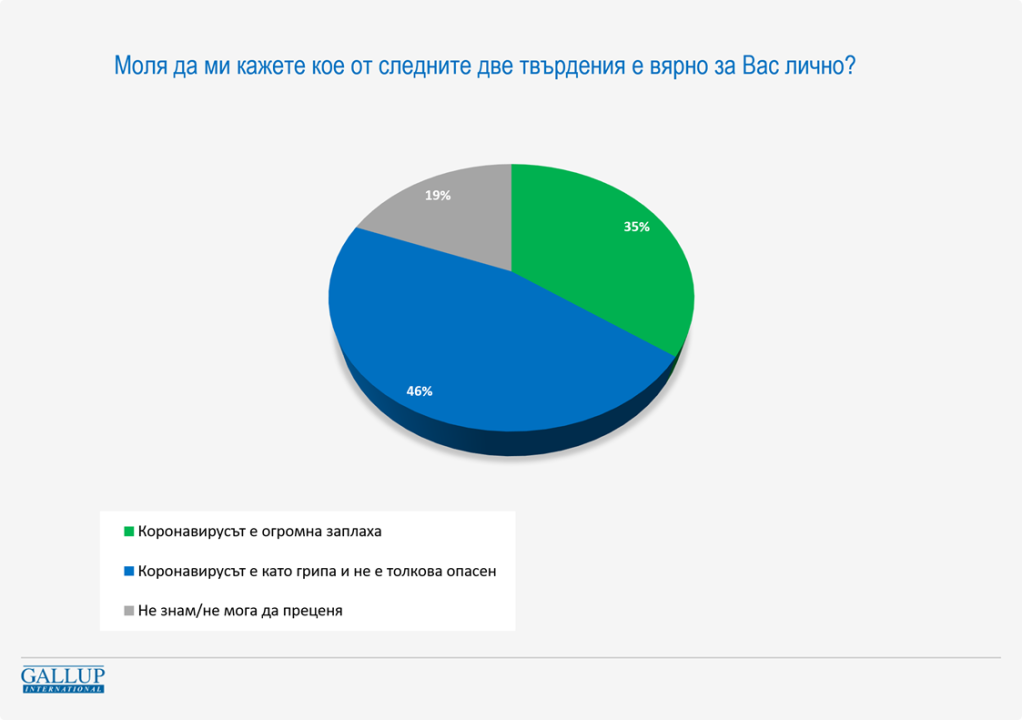Въпреки по-високия процент положителни тестове последния месец, българите сега гледат по-спокойно на ситуацията с коронавируса в сравнение с времето преди месеци. През юли 35% избират опцията „коронавирусът е огромна заплаха“, но 46% са по-близо до мнението „Коронавирусът е като грипа и не е толкова опасен“. Останалите се колебаят. Вероятно това се дължи на своеобразно „обществено свикване“ със заплахата. Тя като че ли вече не е толкова непозната.  Въпросът ясно очертава различията между поколенията – сред най-възрастните закономерно надделява по-голям респект пред вируса, докато при по-младите по-чувствително разпространено е спокойното гледище.